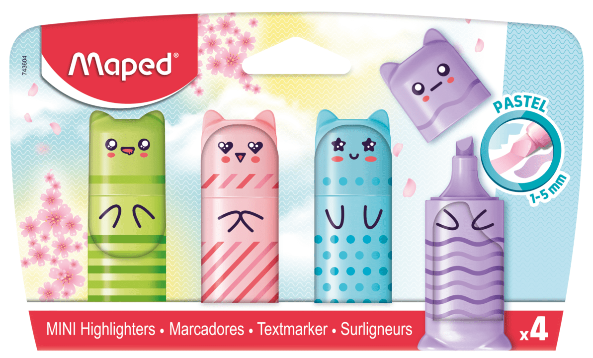 Υπογραμμιστές εξαιρετικής ποιότητας σε παστέλ αποχρώσεις. Κωνική μύτη που μπορεί να υπογραμμίσει από 1-5mm ανάλογα με τον τρόπο που τον χρησμιμοποιείται. Το μελάνι έχει βάση το νερό προσφέροντας ασφάλεια . Μελάνι υψηλής ποιότητας και φωτεινό: δεν κρύβει το κείμενο και δεν σκίζει το χαρτί. Ανθεκτικό σε φωτοτυπίες και φαξ. Επίσης το μελάνι δεν στεγνώνει αν το καπάκι δεν τοποθετηθεί αμέσως (έως 4 ώρες) . Εργονομικός σχεδιασμός. Η συσκευασία αποτελείται από ανακυκλωμένο χαρτόνι.