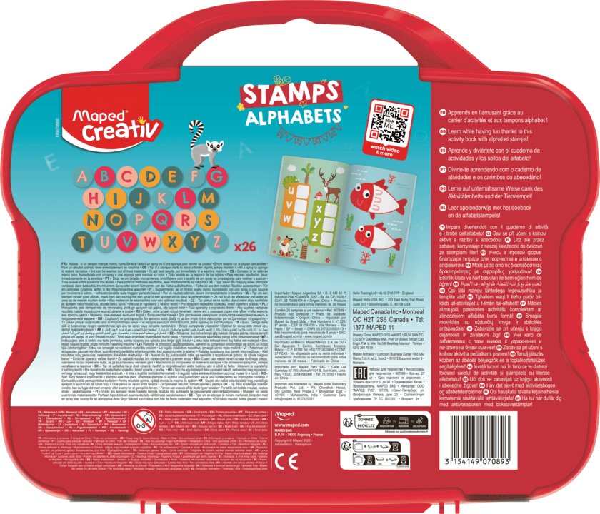 Εκπαιδευτική δραστηριότητα με σφραγιδάκια. Η συσκευασία περιλαμβάνει 26 σφραγιδάκια με την αγγλική αλφάβητο σε διάφορα χρώματα και ένα βιβλίο δραστηριοτήτων. Το μελάνι φεύγει εύκολα από τα χέρια και από τα περισσότερα υφάσματα. Πρακτικό βαλιτσάκι για εύκολη αποθήκευση. Κατάλληλο για ηλικίες 3+