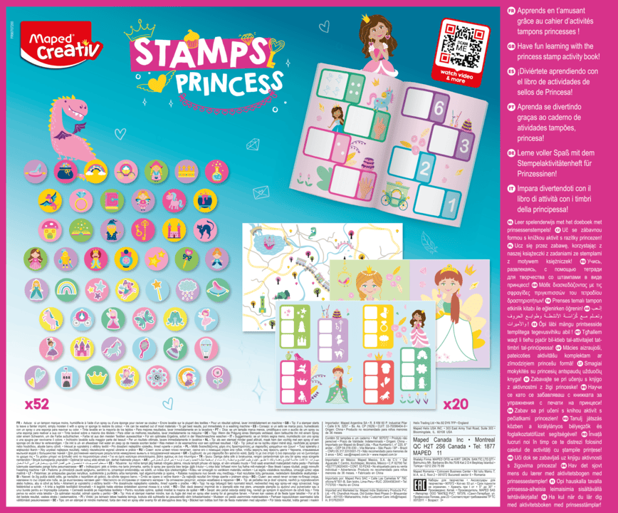 Μια εκπαιδευτική και διασκεδαστική δραστηριότητα με σφραγιδάκια. Η συσκευασία περιλαμβάνει 52 σφραγιδάκια εμπνευσμένα από τον κόσμο με τις πριγκίπισσες και ένα βιβλίο δραστηριότητων για ατελειώτες ώρες παιχνιδιού και δημιουργίας!