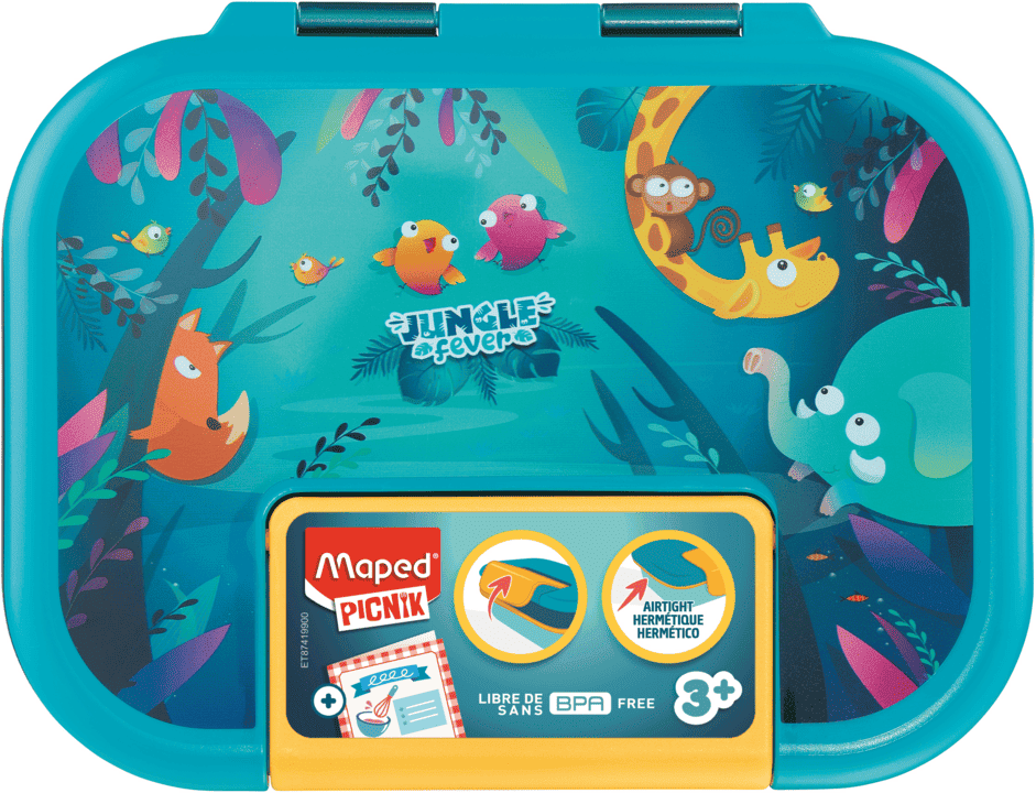 Το φαγητοδοχείο Jungle Fever της Maped έχει χωρητικότητα 900ml και είναι κατάλληλο για ηλικίες 3+ Είναι κατασκευασμένο από ένα βιολογικό υλικό Ecozen το οποίο ανακυκλώνεται πολύ εύκολα. Ανοίγει με μία μόνο κίνηση χάρη στο κλιπ / καπάκι που διαθέτει. Το καπάκι είναι ενσωματωμένο στο φαγητοδοχείο, οπότε ποτέ δεν θα το χάσετε. Εξαιρετικά πρακτικό ορθογώνιο σχήμα για να χωρέσει ένα γεύμα. Είναι αεροστεγή και μπαίνει στο φούρνο μικροκυμάτων με ανοιχτό το καπάκι. Πλένται στον πλυντήριο των πιάτων. Η συσκευασία περιλαμβάνει ένα βιβλιαράκι με συνταγές για γεύματα υγιεινά για τα παιδιά μας. Κατάλληλο για ηλικίες 3+
